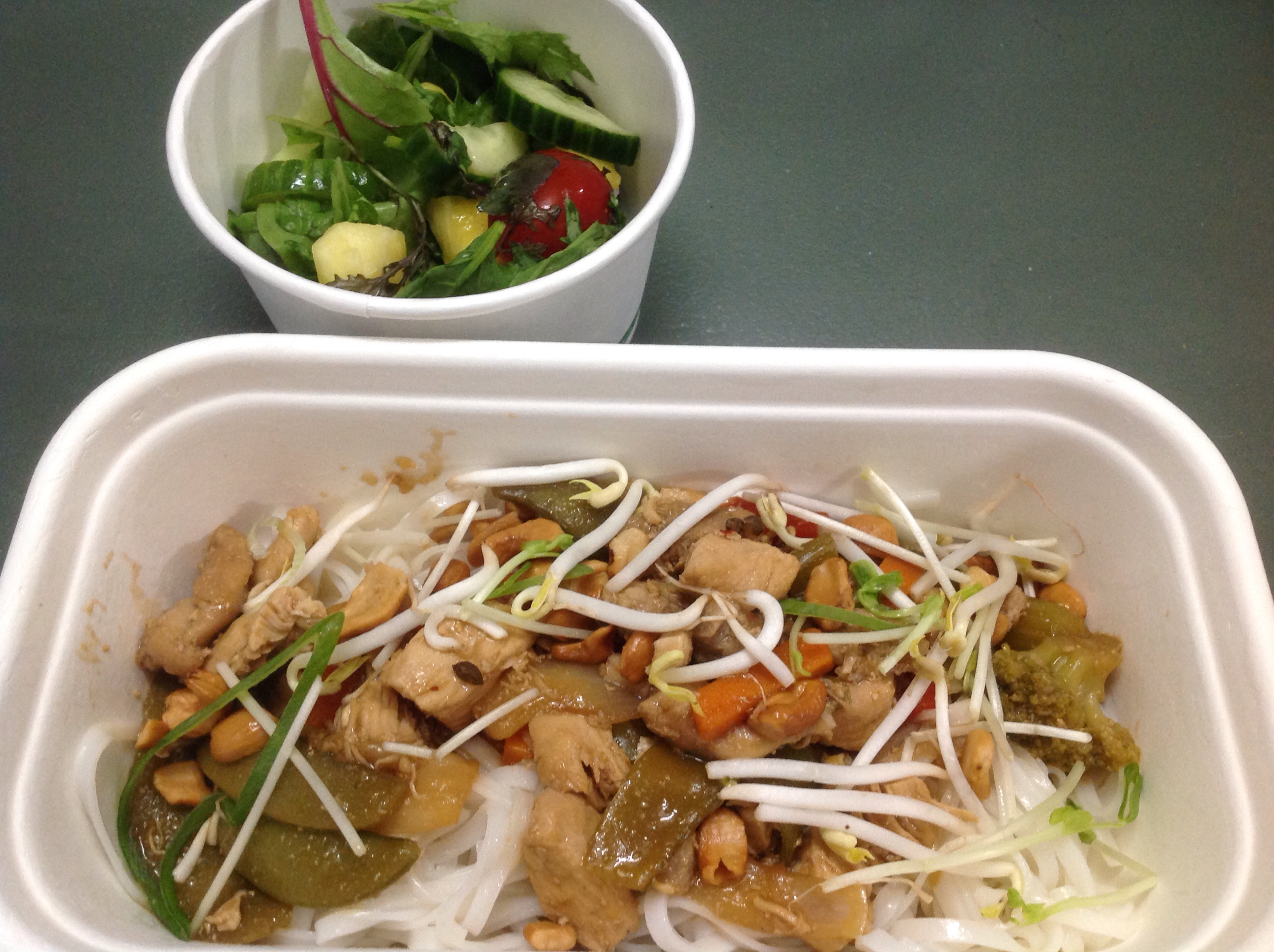 本を読んだり、友達とLINEなどしている間に、昼食の時間。昨日注文したChicken Stir-Fry with vegetable noodled & cashew nuts and Chef’s salad。まあまあかな。