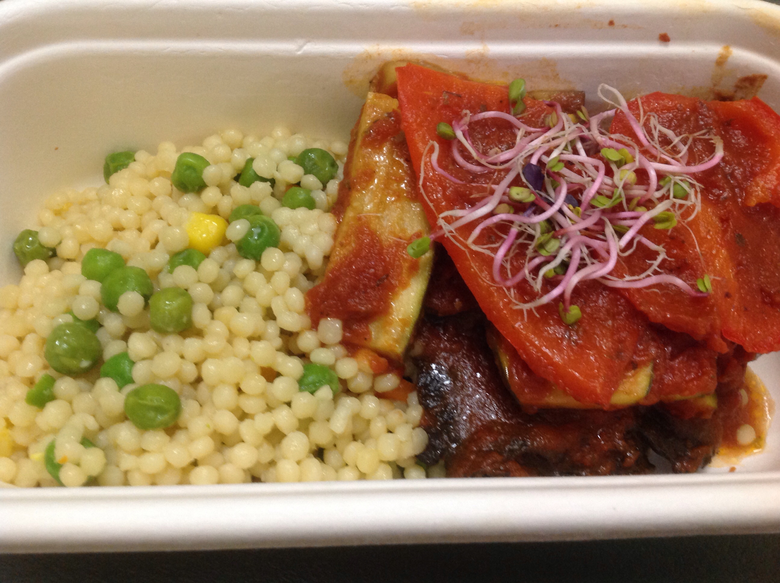 なんだかんだ言っている間に、18:30。夕食。なんだろうこれ。Vegetable Ratatouille with herb couscous。まあまあ。デザートはアイスクリーム。