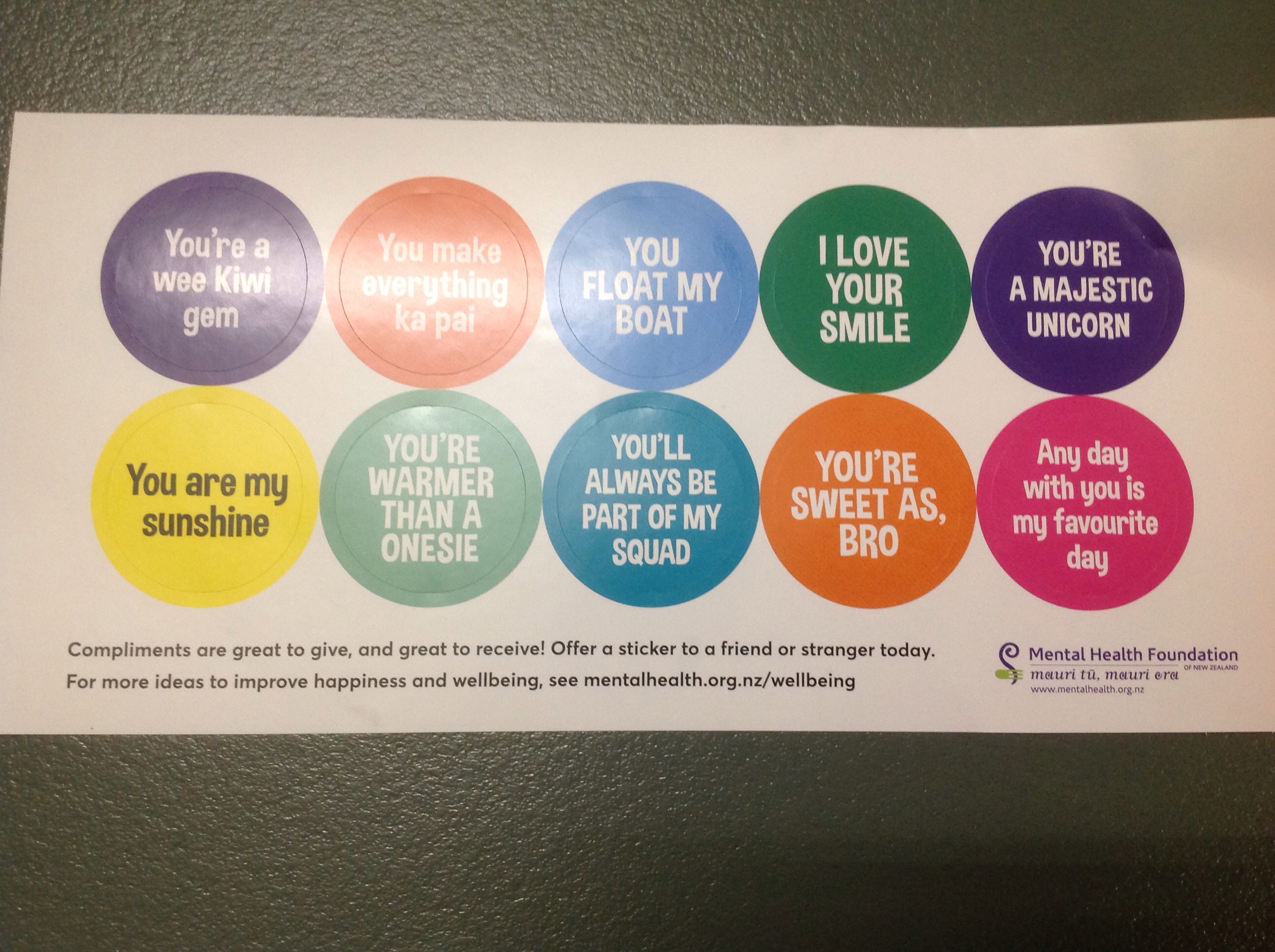 朝食の袋の中にこんなのが入っていた。元気づけのためかな。日本でも使われだしている「ウェルビーング Wellbeing」。身体的、精神的、社会的に良好な状態にあることを意味する概念で、「幸福感」。ニュージーランドは、どうしてと思うが、若年層の自殺が非常に多い。ということで、学校を中心にこのWellbeingを重要視している。試験制度も、生徒はもちろん教師のWellbeingを考慮に入れる方向に進んでいる。