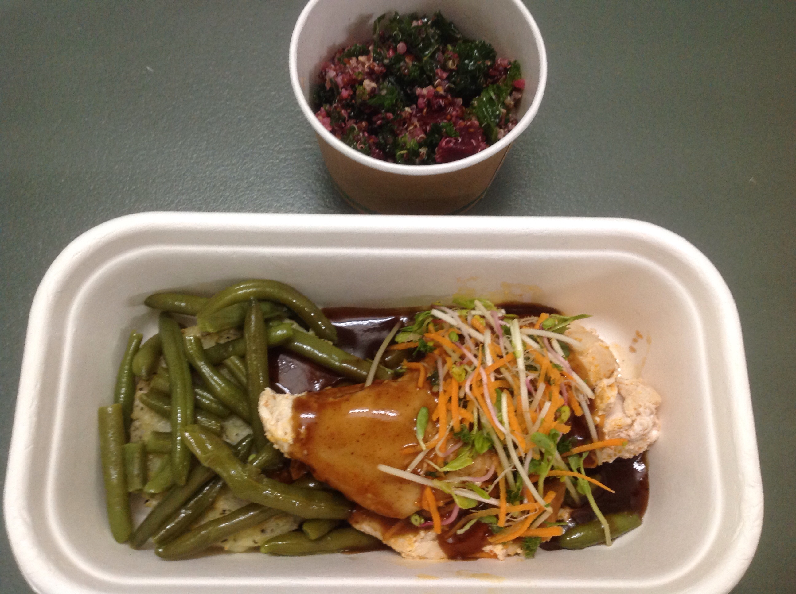 12時半、昼食。BBQ Chicken with green beans, potato rösti & smokey BBQ sauce and Chef’s Salad。