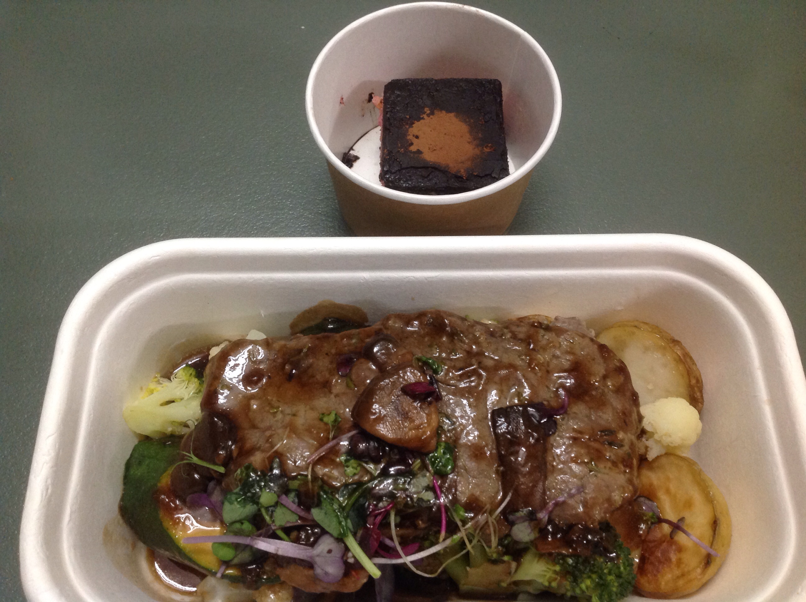 オンライン飲み会中に、夕食到着。Char Grilled Sirloin with roast vegetables, potato / mushroom sauce and Chefäs Dessert。にんにくがとても効いてておいしかった。硬いのではとちょっと心配していたが、結構やわらかかった。