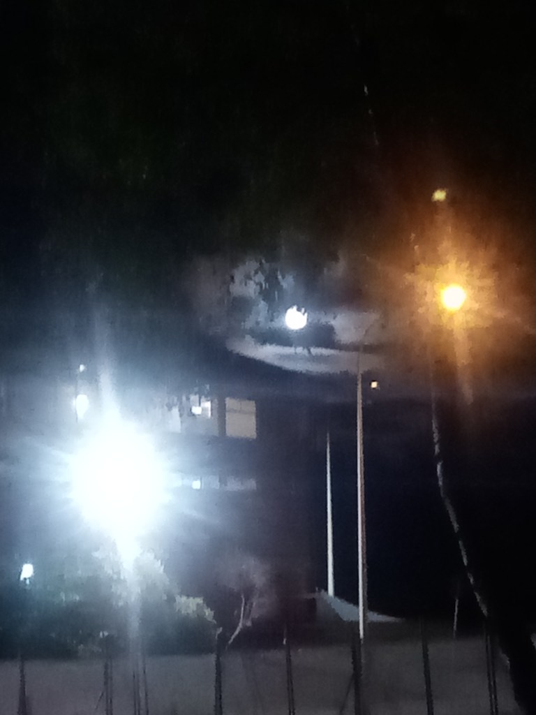 で、やったあああ。きれいな満月を仰ぎ見ることができた。本当にきれいだった。散歩場を照らしている光が強かったので、写真は上手く撮れなかったが、、真ん中のがお月さま。