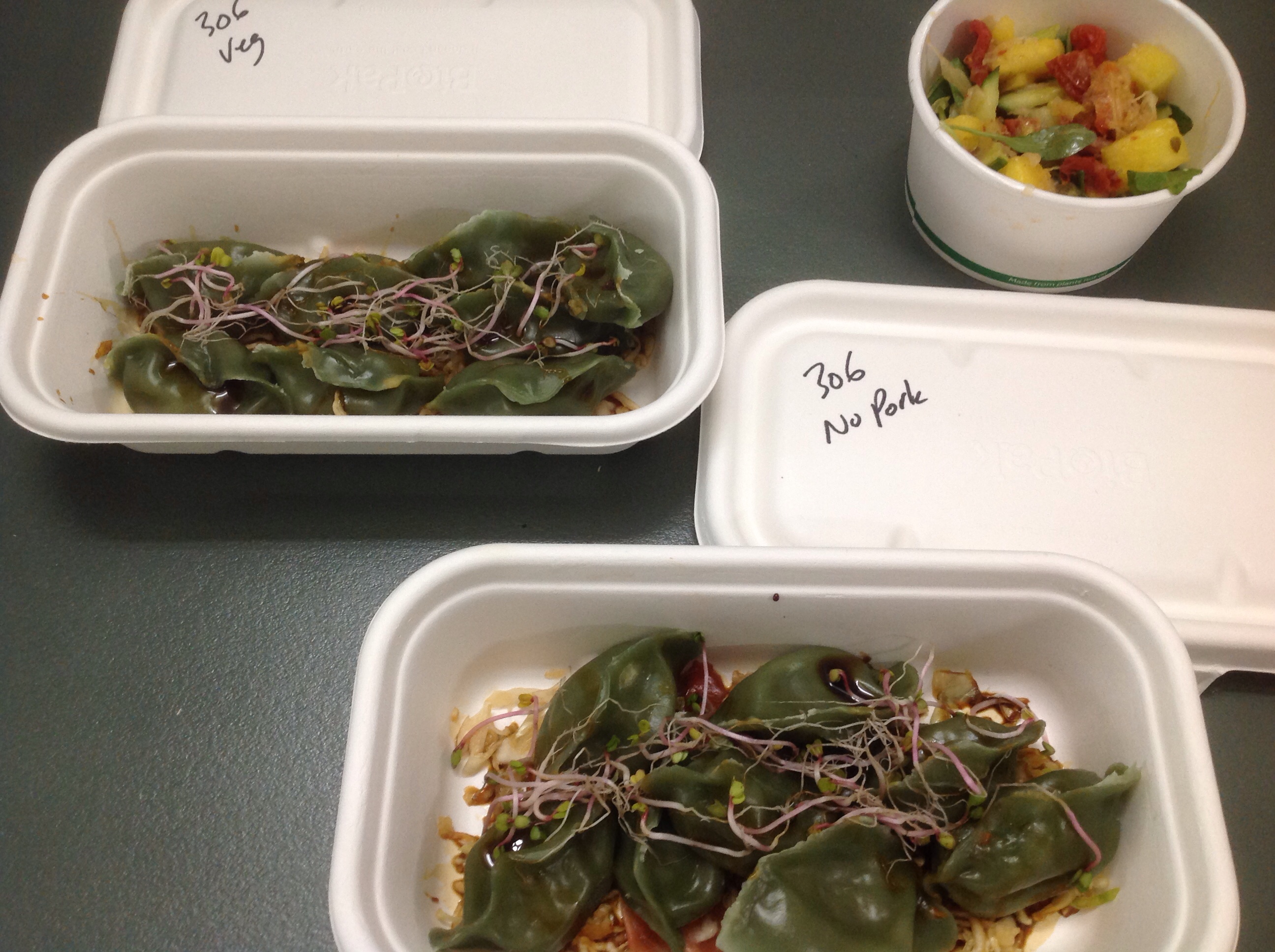 だって、普通食は、Pork, Chivers / Prawn Dumplings with pickled ginger / soy cabbageなんだもん。豚食べないもん。ベリタリアン食でしょう。Vegetable Dumplingsです。