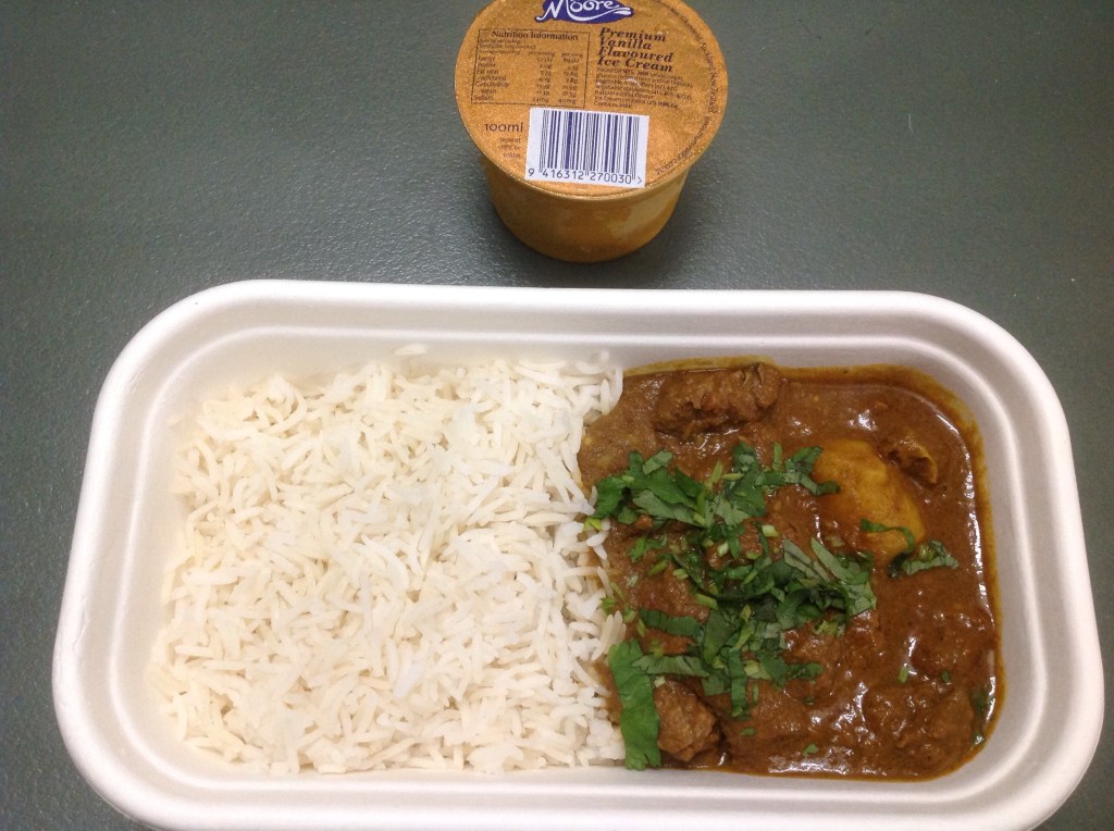 Beef and Potato Curry with basmati rice and Chef’s Desser。お肉たくさん、入ってた。